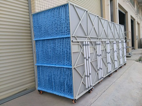采用定制工装车,中空板内衬+多层布袋,60片/台车